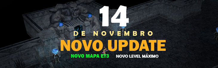 Novidades imperdíveis para todos! Novo nível máximo 115 e a chegada de um mapa ET3 com entrada a partir do nível 110. Além disso, teremos a Mina do Gelo, que será liberada após X dias. A experiência até o nível 110 será facilitada, e novos itens da linha 102 estarão disponíveis no "DROP HARD" de ET3. Também, a linha 102 pode ser dropada com uma pequena chance em ET2! Premiação para os 3 primeiros níveis de cada classe. Fique atento! Promoção 2x exp vai até 14/11. Mais detalhes em breve!